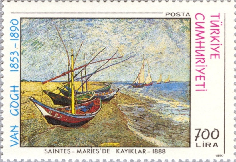 1990 Paintings by Vincent Van Gogh (1853-1890), Set of 4. Designs: 300 l, Self-portrait, vert. 700 l, Fishing Boats on the Beach at Saintes-Maries [Boats in Saintes Marines]. 1000 l, Vase with Sunflowers (Fourth version repetition), vert. 1500 l, Road with Cypress and Star.