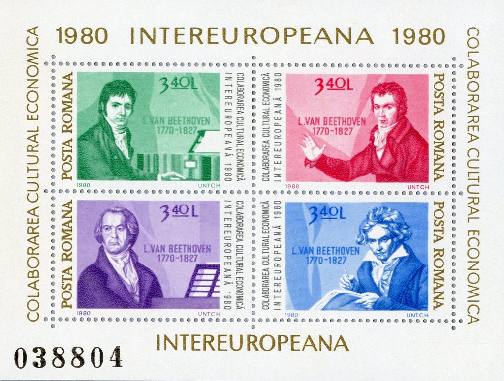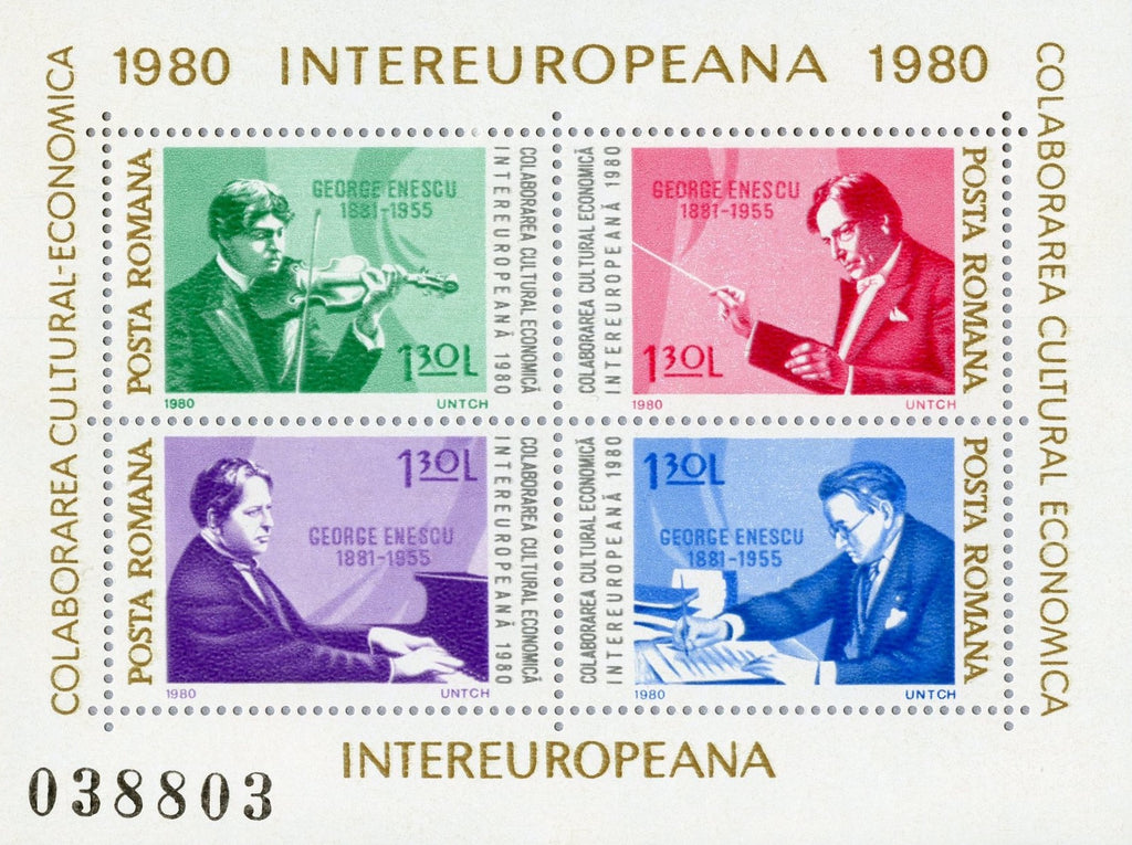 1980 Inter-European Cultural and Economic Cooperation, 2 Souvenir Sheets, 4 stamps each. Designs: No. 2948, George Enescu: a, Playing violin. b, Conducting. c, Playing piano. d, Composing. No. 2949, Beethoven: a, In library. b, Portrait. c, At piano. d, Composing.